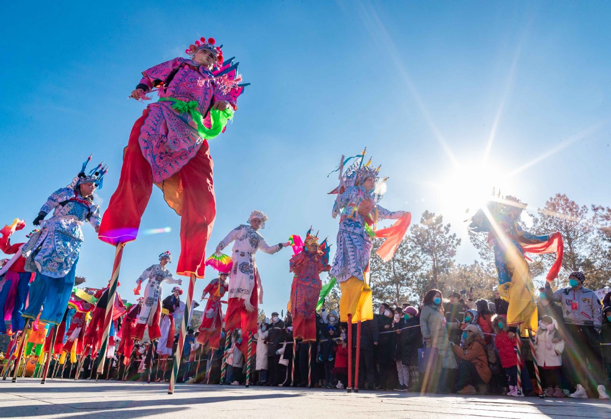 Folk artists perform on stilts at a temple fair in Hohhot, Inner Mongolia, on Jan 27, 2023. [Photo by Ding Genhou/chinadaily.com.cn]