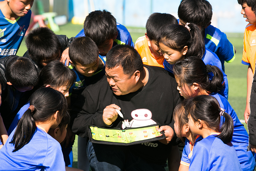 Coach Xu Zhaowei explains tactics during a soccer game at Yuanbao Primary School in Dafang county, Guizhou province. [PHOTO by ZHOU XUNGUI/FOR CHINA DAILY]
