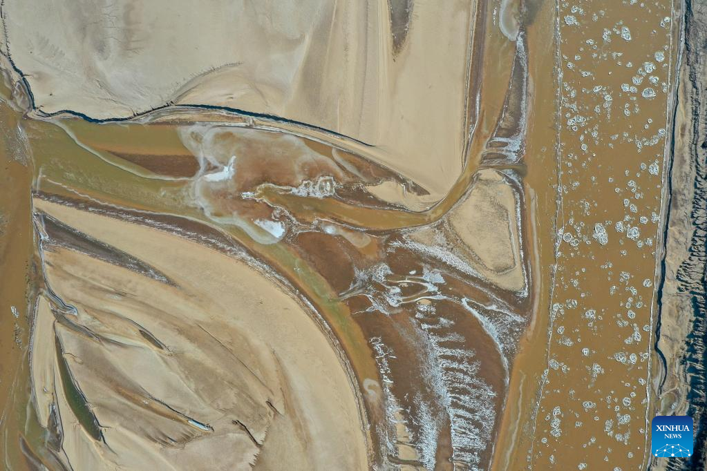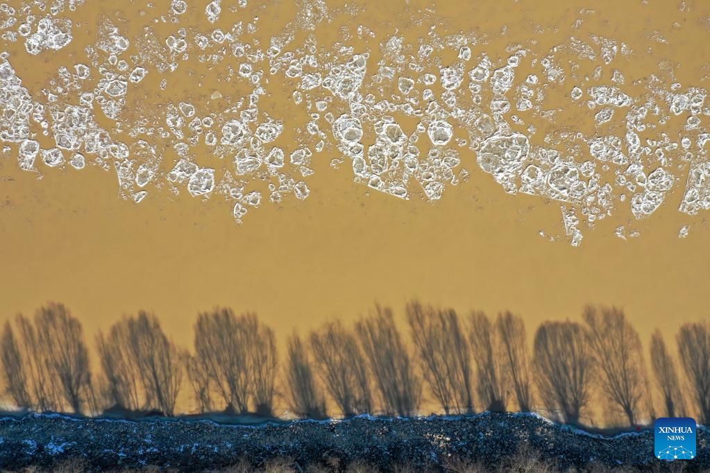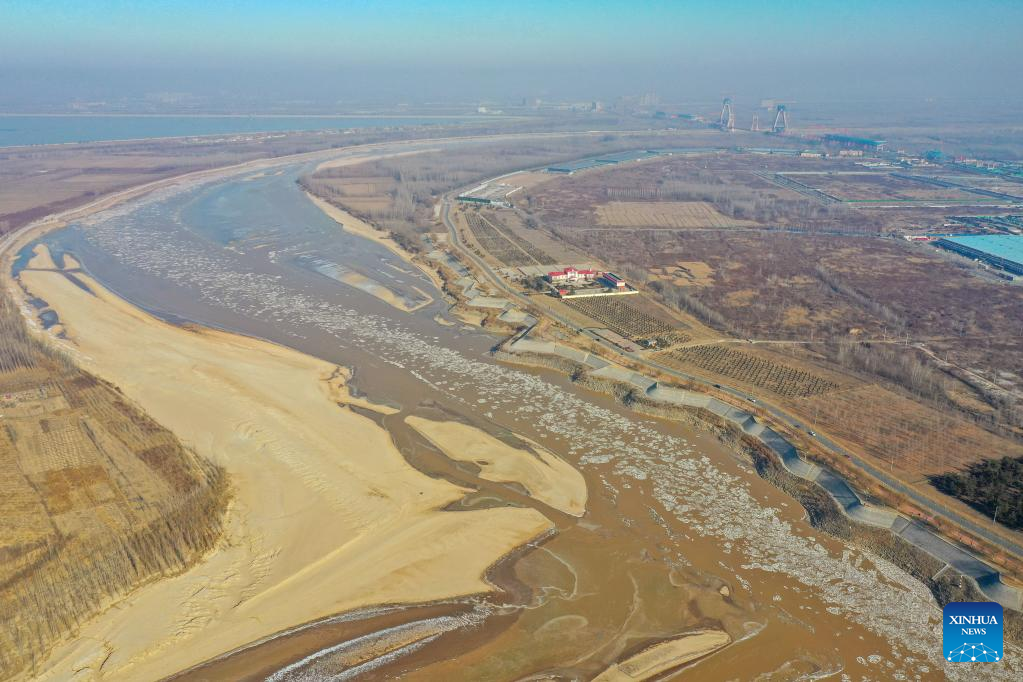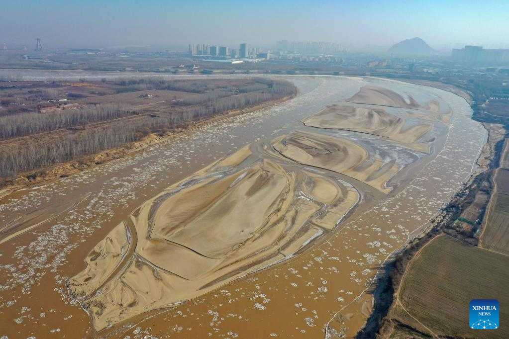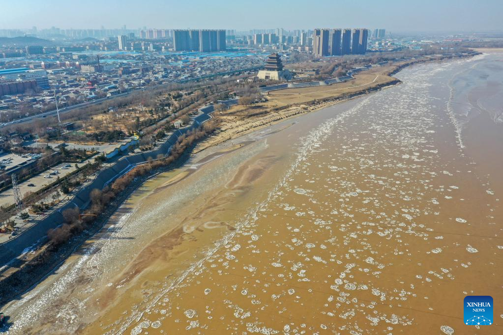 This aerial photo taken on Jan. 27, 2023 shows ice jam on the Yellow River in Jinan, east China's Shandong Province. The segment of the Yellow River in Jinan City witnessed ice jam scenes due to a strong cold wave recently. (Xinhua/Zhu Zheng)