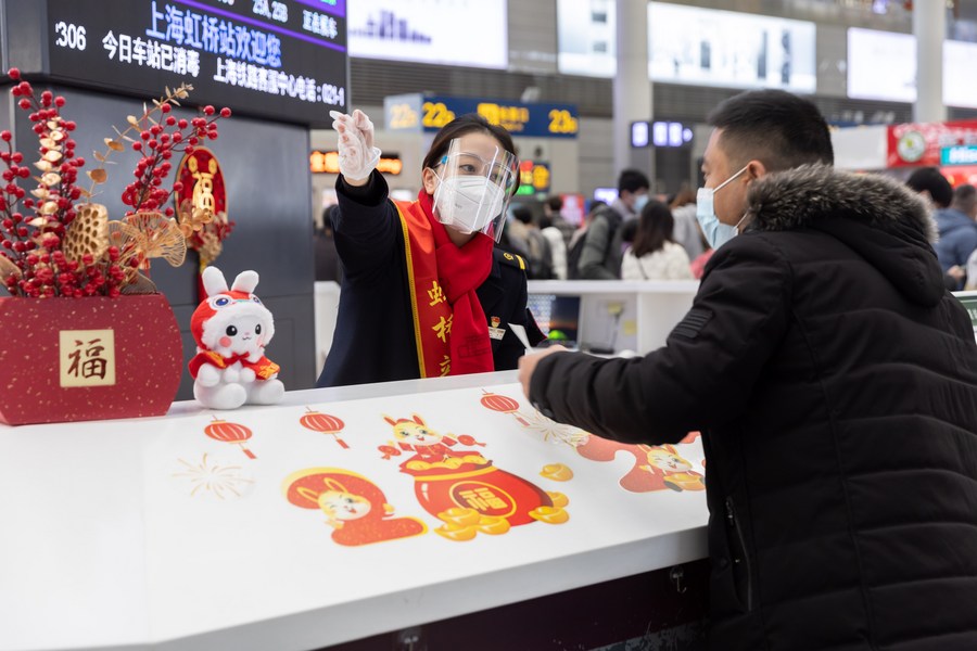 A staff member guides a passenger at Shanghai Hongqiao Railway Station in east China's Shanghai, Jan. 21, 2023. (Xinhua/Wang Xiang)