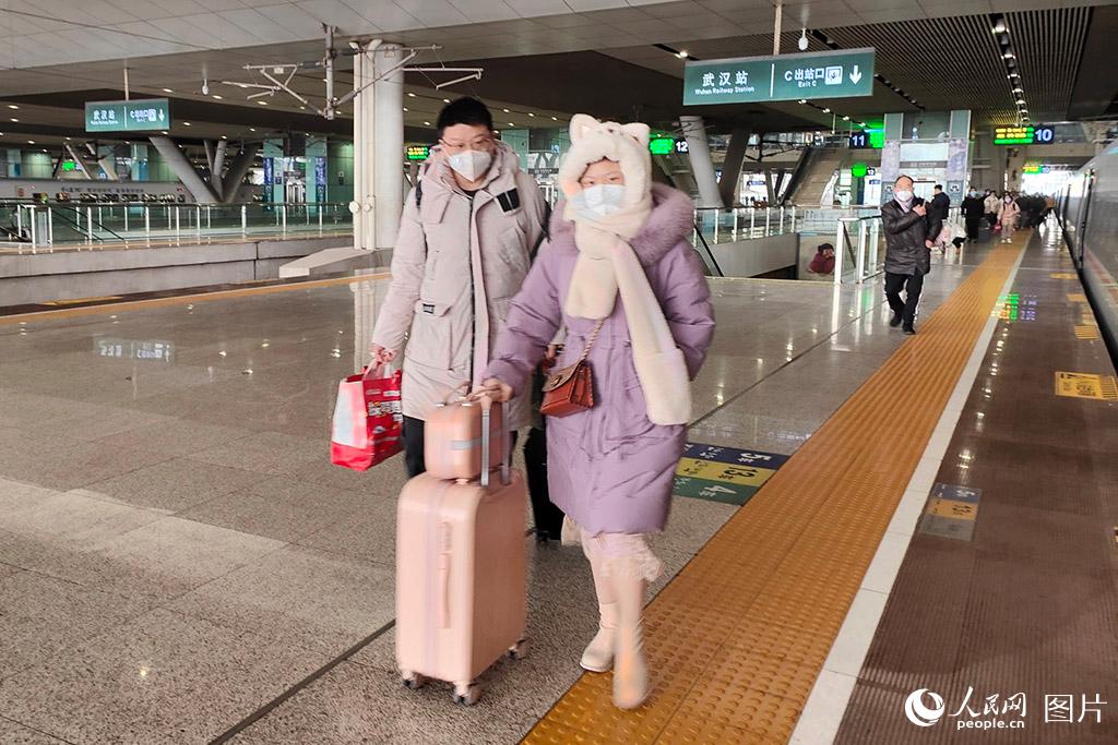 Travelers walk to board a train at Wuhan Railway Station in Wuhan, central China’s Hubei Province, Jan. 23, 2023. (People’s Daily Online/Zhang Pei)