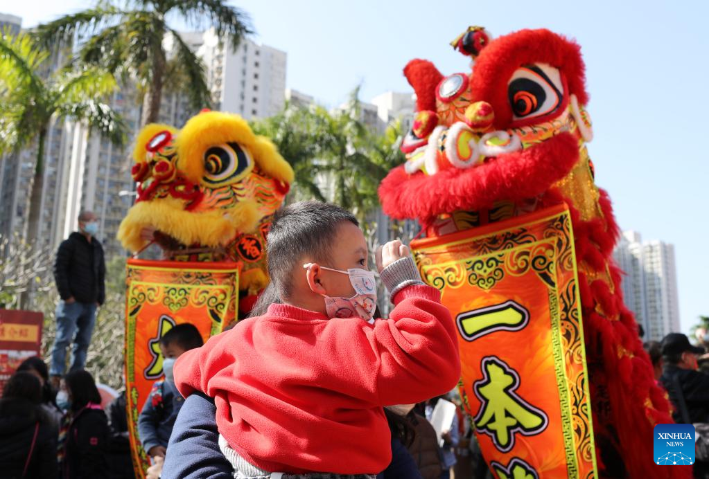 People watch lion dance in Hong Kong, south China, on Jan. 28, 2023. (Xinhua/Li Gang)