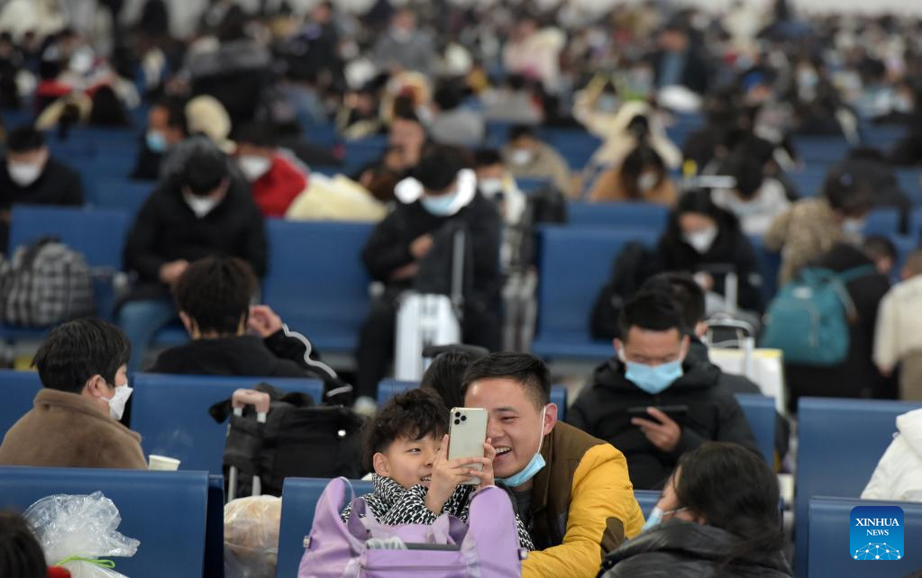 Passengers wait at Fuyang West Railway Station in Fuyang City, east China's Anhui Province, Jan. 27, 2023. Fuyang West Railway Station was bustling with passengers on Friday, the last day of the Spring Festival holiday. As more railway stations have been put into use in the city, more people choose to travel by high-speed train to go to work or visit families. The city has seen a sharp increase in the number of railway passengers. (Xinhua/Guo Chen)