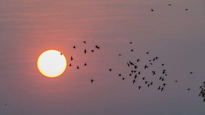 Photo shows blossom-headed parakeets against sunset in Ruili city, southwest China’s Yunnan Province. (Photo/Sun Dongjun)