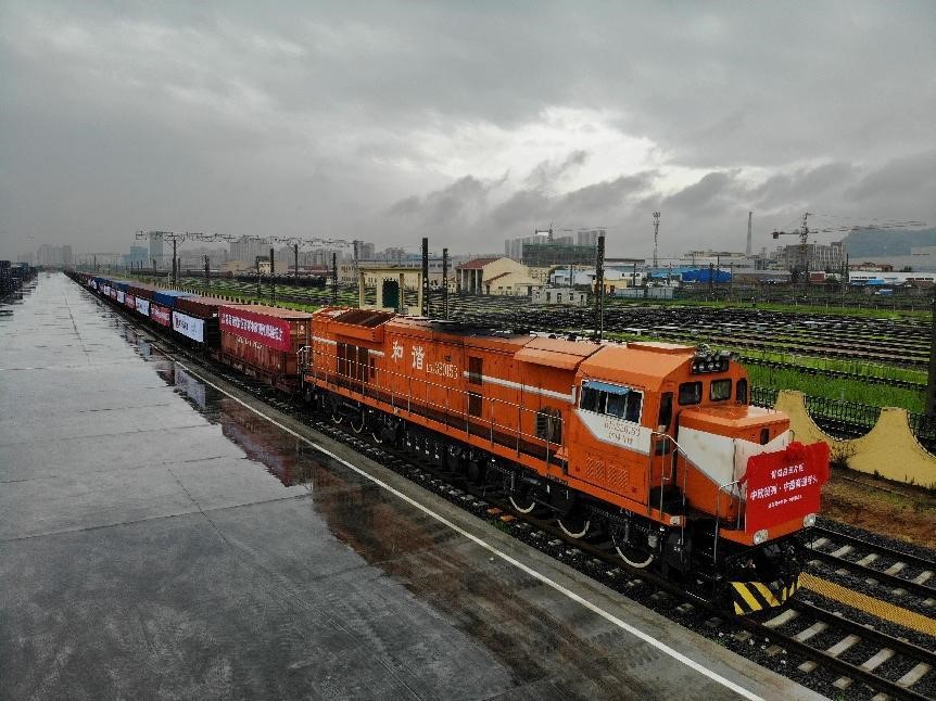A fully loaded freight train arrives at a logistics park in the Qingdao area of China (Shandong) Pilot Free Trade Zone, July 17, 2022. (People's Daily Online/Xue Bing)