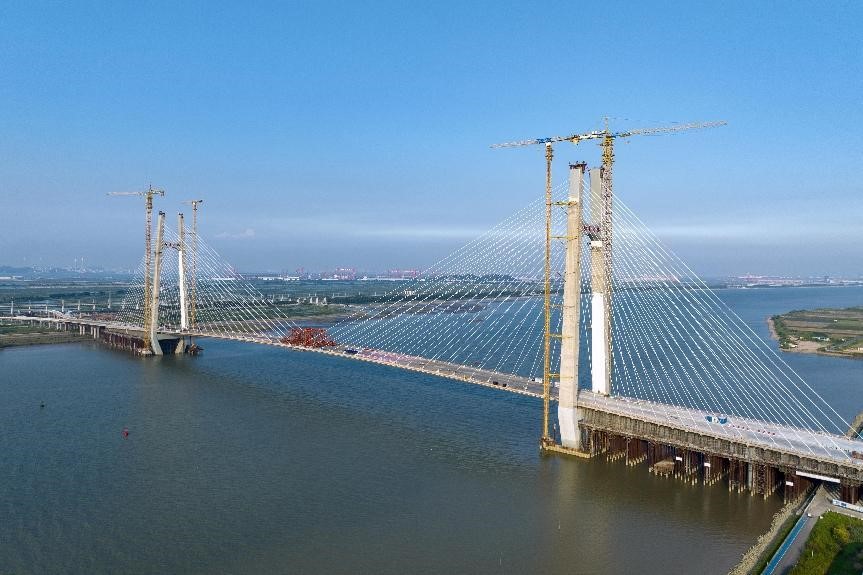 The Honglian Bridge linking an island in the Nansha Free Trade Zone with other parts of Guangzhou has its main structure joined together in south China's Guangdong province, July 25, 2022. (People's Daily Online/Wei Jinsong)