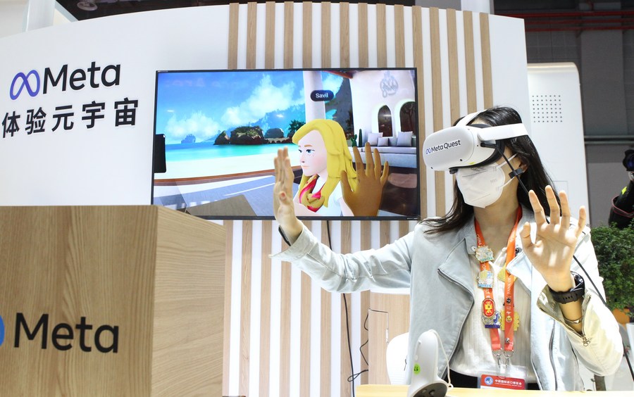 A visitor tries a VR device to experience the metaverse in the Intelligent Industry and Information Technology exhibition area of the fifth China International Import Expo (CIIE) in east China's Shanghai, Nov. 7, 2022. (Xinhua/Hou Jun)