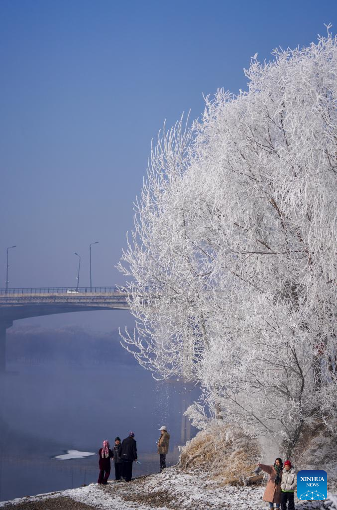 People enjoy the rime scenery near the Songhua River in Jilin City, northeast China's Jilin Province, Jan. 30, 2023. (Xinhua/Yan Linyun)