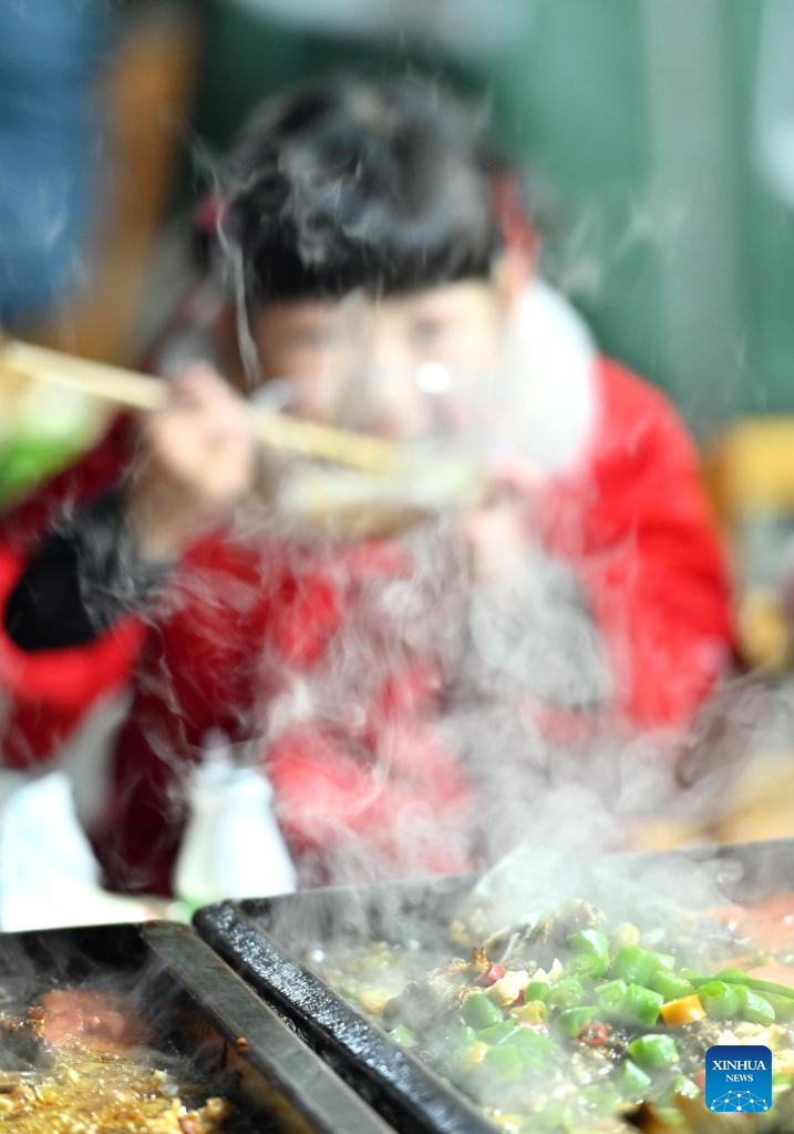 A girl enjoys local food at a scenic spot in Xuan'en County, central China's Hubei Province, Jan. 29, 2023. Xuan'en County has built footpaths, fountains and snack booths along the Gongshui River to boost nighttime economy. (Photo by Chen Xukai/Xinhua)