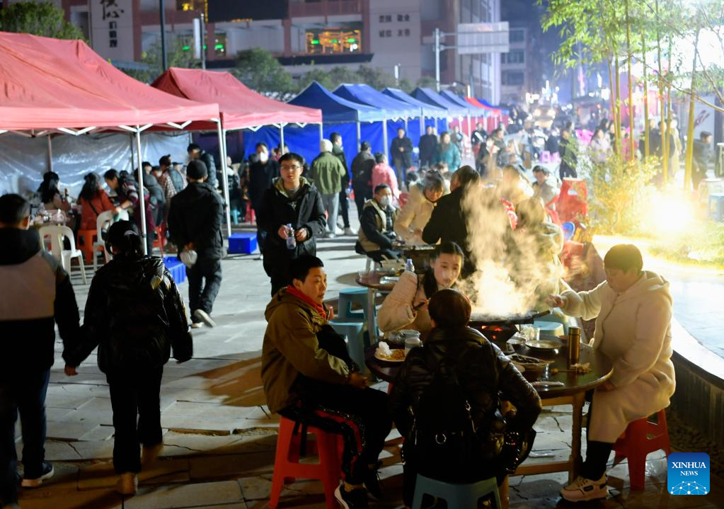 People buy kebabs at a scenic spot in Xuan'en County, central China's Hubei Province, Jan. 29, 2023. Xuan'en County has built footpaths, fountains and snack booths along the Gongshui River to boost nighttime economy. (Photo by Song Wen/Xinhua)