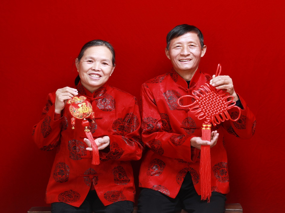 Yu Sufang and Niu Huadeng, a sanitation worker couple in Huangyan district, Taizhou City, east China's Zhejiang Province, receive their photo taken for the Spring Festival for free by local photographer Wang Minzhi. (Photo/China Media Group)