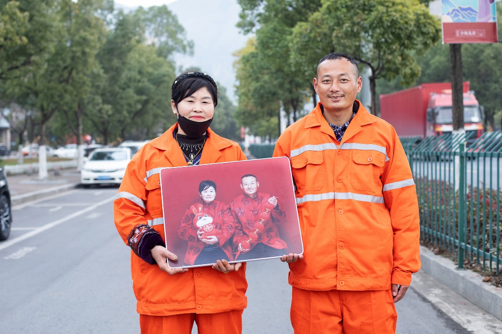 A photo of Wang Meiling and Zhu Jie, a sanitation worker couple in Huangyan district, Taizhou City, east China's Zhejiang Province. The photo was taken for the Spring Festival for free by local photographer Wang Minzhi. (Photo/China Media Group)