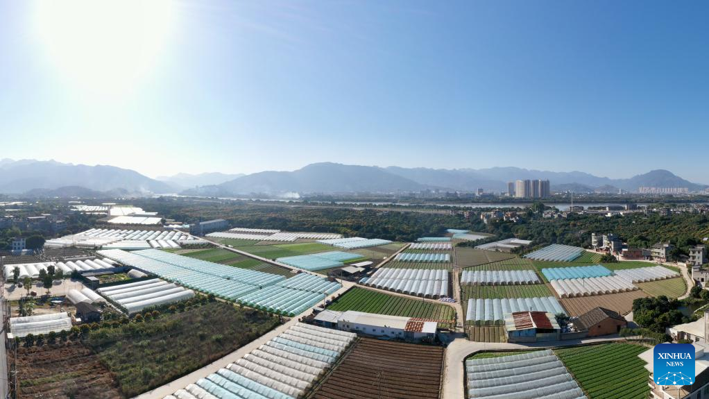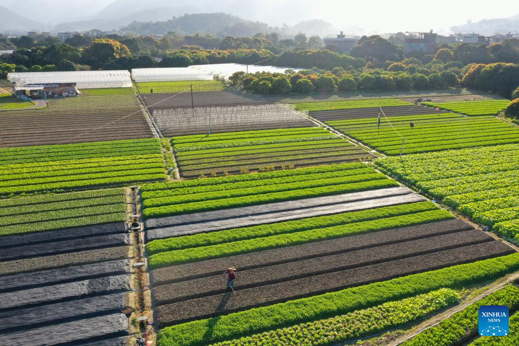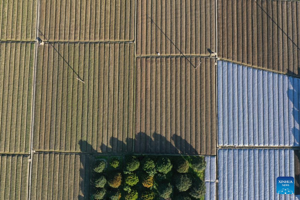 This aerial photo taken on Jan. 31, 2023 shows a vegetable planting area in Nantong Township of Minhou County, southeast China's Fujian Province. (Xinhua/Jiang Kehong)
