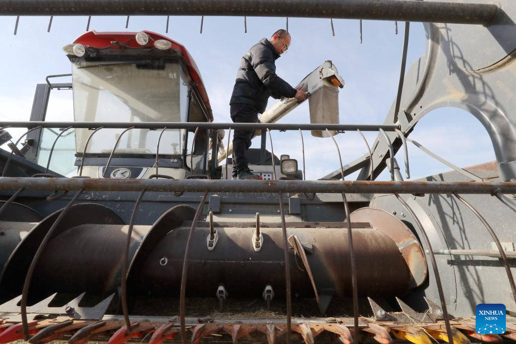 A technician maintains a farming machine at a provincial grain production demonstration zone in Xin'an Township of Deqing County, east China's Zhejiang Province, on Jan. 31, 2023. (Photo by Xie Shangguo/Xinhua)