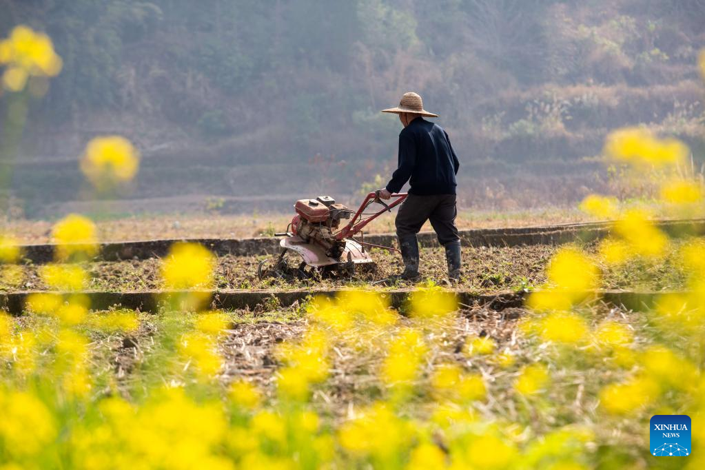 A farmer works in a field in Nanmen Village of Taihe County, east China's Jiangxi Province, on Jan. 31, 2023. (Photo by Deng Heping/Xinhua)