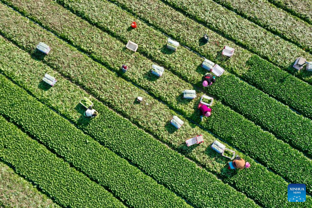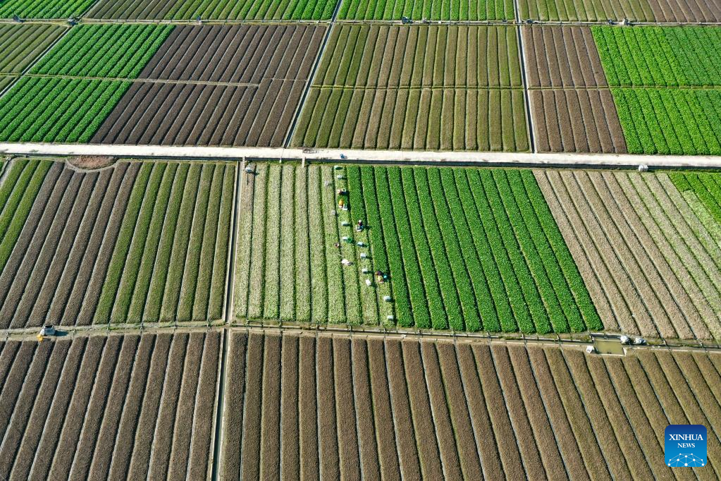 This aerial photo taken on Jan. 30, 2023 shows farmers harvesting vegetables in a field in Nantong Township of Minhou County, southeast China's Fujian Province. (Xinhua/Jiang Kehong)