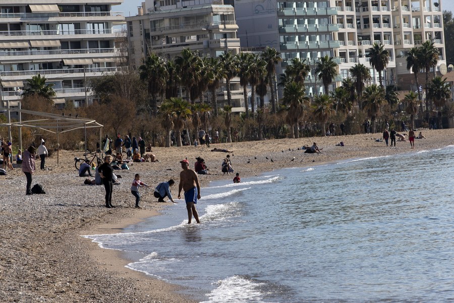 People spend time at a beach in Faliro, a southern suburb of Athens, Greece, on Jan. 6, 2023. (Xinhua/Marios Lolos)