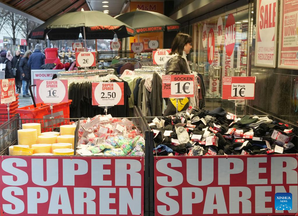 People shop at a store with discount signs in Berlin, Germany, on Feb. 1, 2023. Annual inflation in the eurozone is projected to fall to 8.5 percent in January from 9.2 percent in December 2022, according to a flash estimate published on Wednesday by Eurostat, the European Union's (EU) statistical bureau. (Photo by Stefan Zeitz/Xinhua)