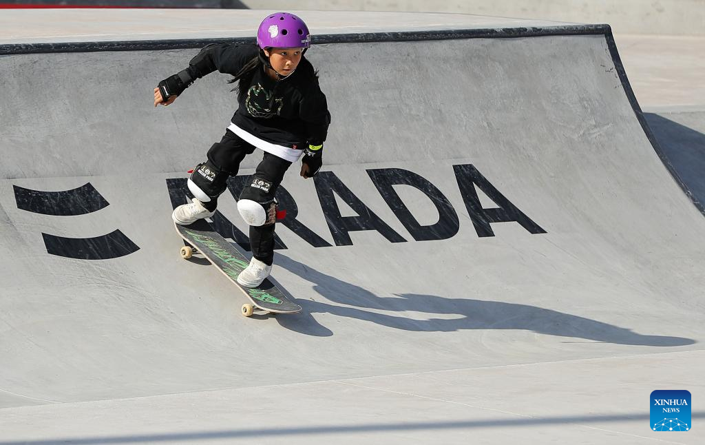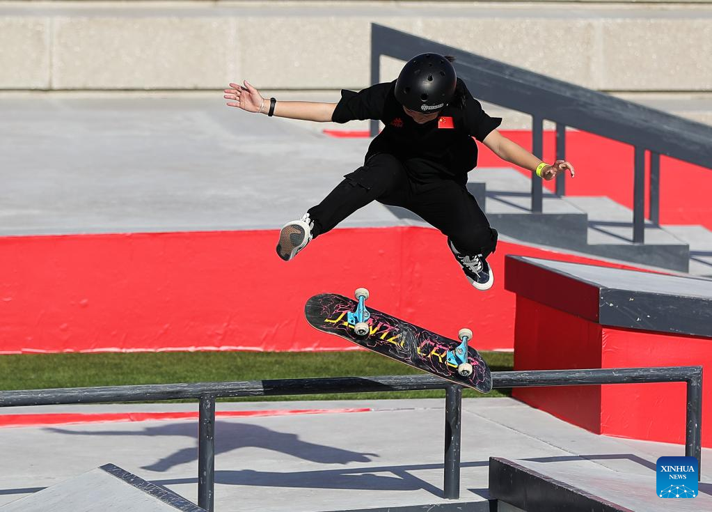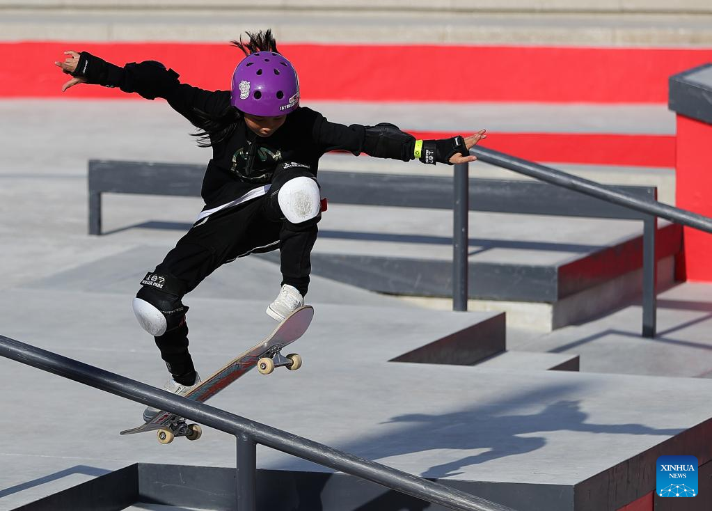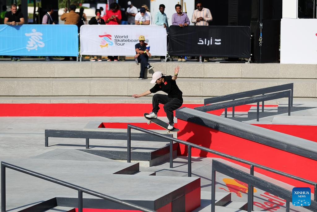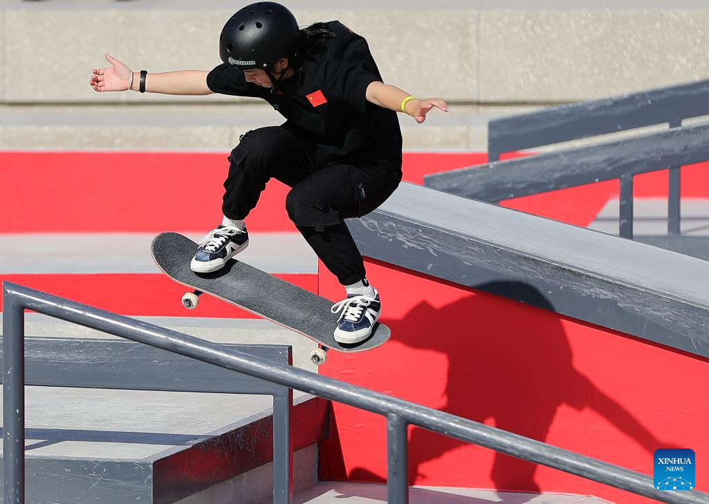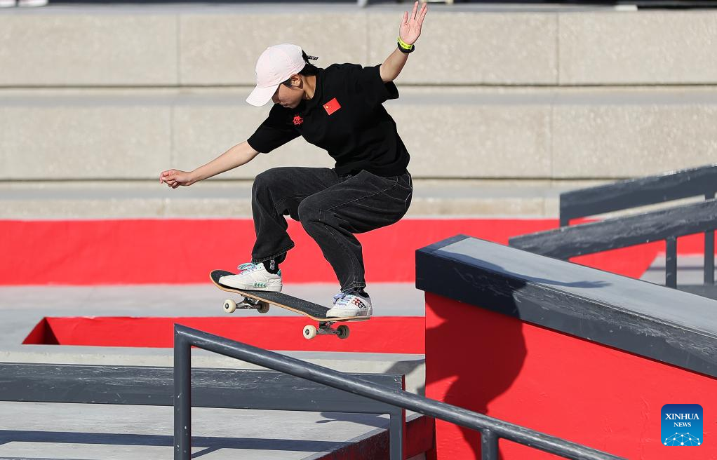 Cui Chenxi of China competes during the women's street qualifiers at the 2022 Skateboarding Street and Park World Championships in Sharjah, the United Arab Emirates (UAE), Feb. 1, 2023. (Xinhua/Wang Dongzhen)