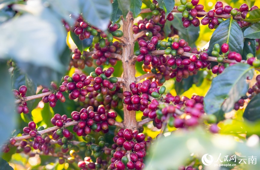 Photo shows red coffee beans in Menglian Dai, Lahu and Wa autonomous county, Pu’er, southwest China’s Yunnan Province. (People’s Daily Online/Hu Zunhui)