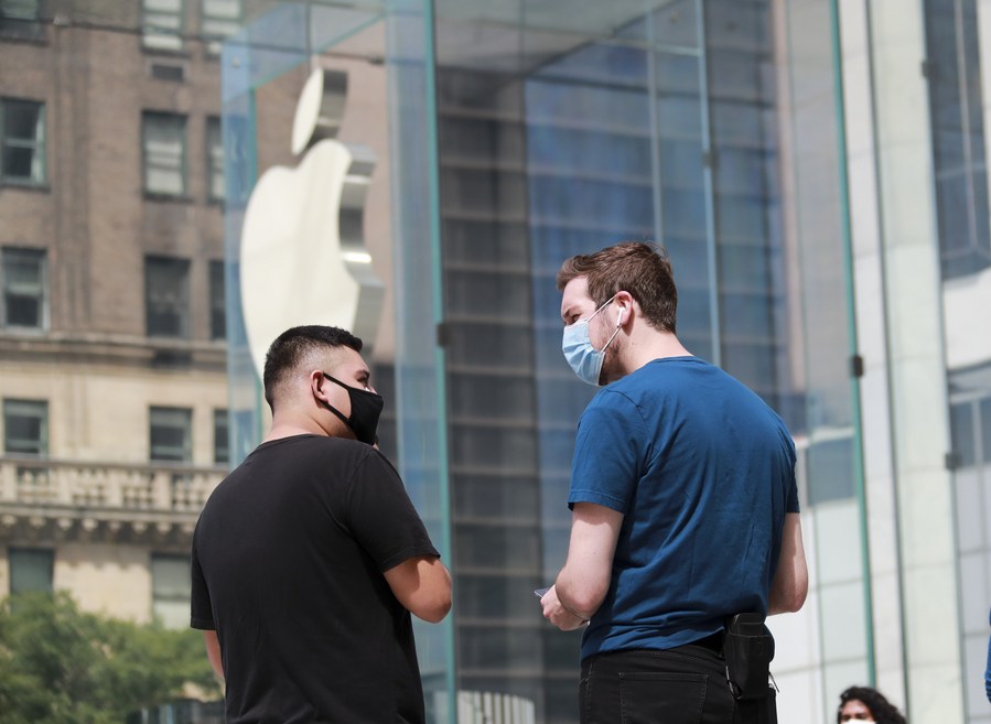 A staff worker talks with a customer outside an Apple store on Fifth Avenue of New York City, the United States, June 17, 2020. (Xinhua/Wang Ying)