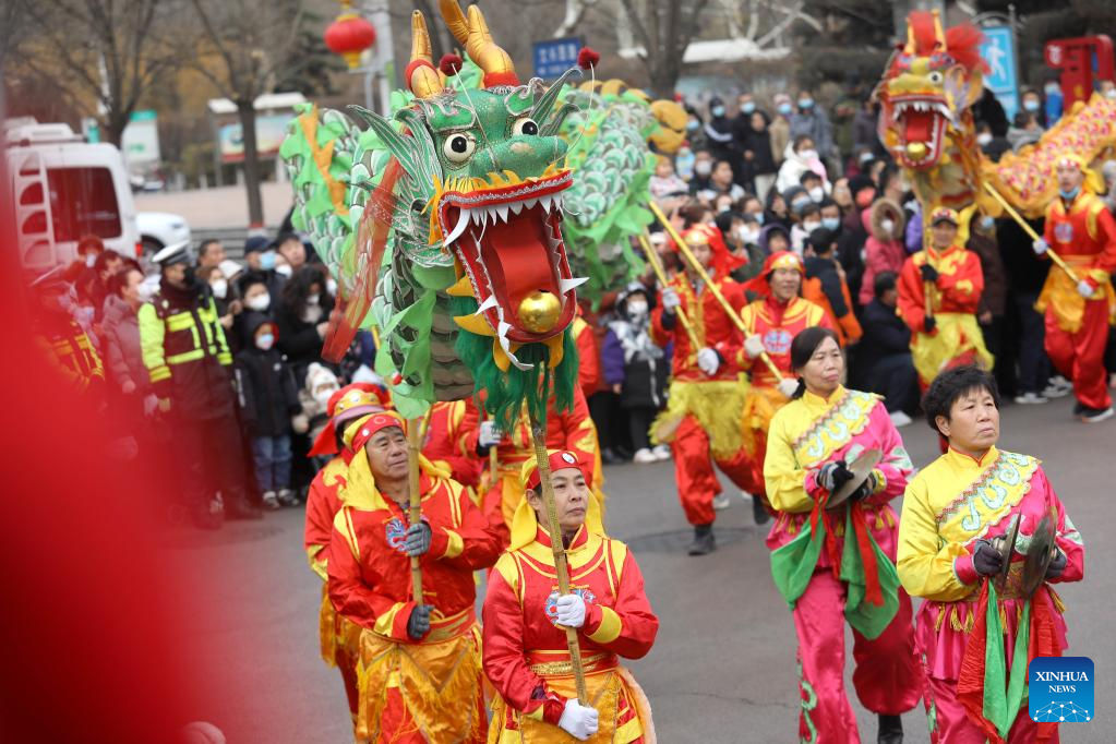 Folk artists perform dragon dance during a folk activity in Shijiazhuang City, north China's Hebei Province, Feb. 2, 2023. (Photo by Liang Zidong/Xinhua)