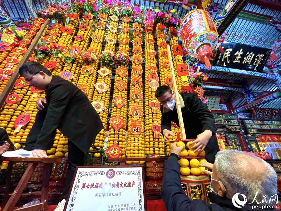 Young people build orange pagodas in Pukou Palace of Jiangdong village in Putian city, southeast China’s Fujian Province. The orange pagoda of Pukou Palace is one of Fujian Province’s intangible cultural heritages. (People’s Daily Online/Lin Ying)