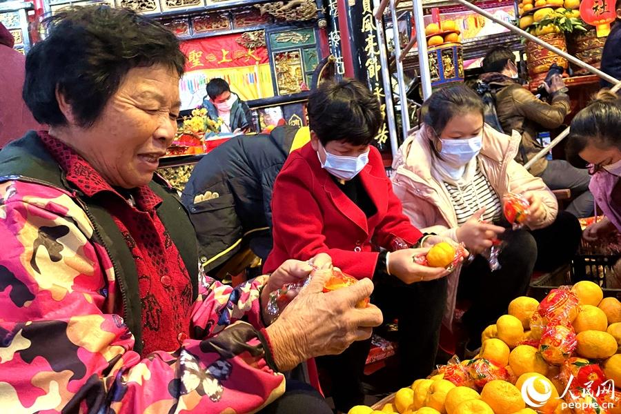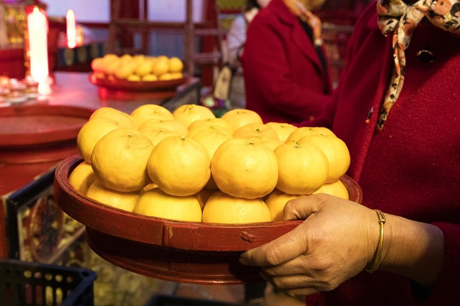 On Jan. 24, 2023, the third day of the first lunar month, Jiangdong villagers were busy piling up oranges in Pukou Palace, a local custom in which they pray for blessings, safety and good fortune in the New Year. The orange pagoda originates from the fruit shrine that was built as a tribute to Imperial Consort Mei of the Tang Dynasty (618-907), whose hometown was Jiangdong village.
