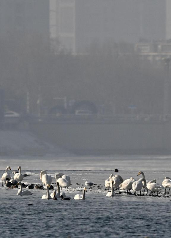 Swans rest on the Peacock River in Korla city, northwest China's Xinjiang Uygur autonomous region, Feb 2, 2023. (Photo: China News Service/ Que Hure)