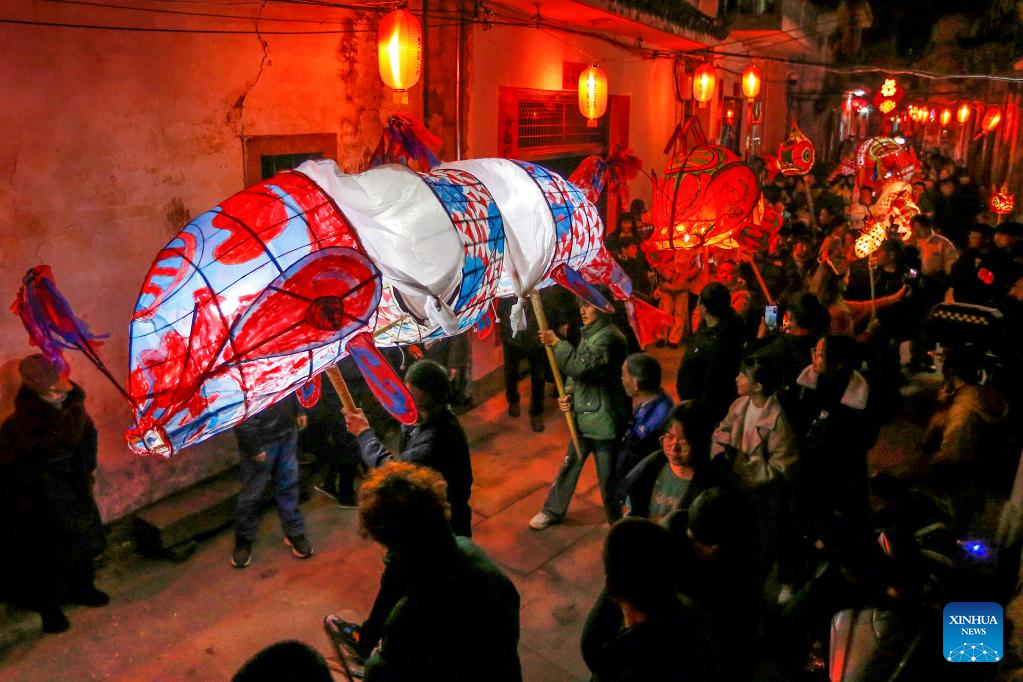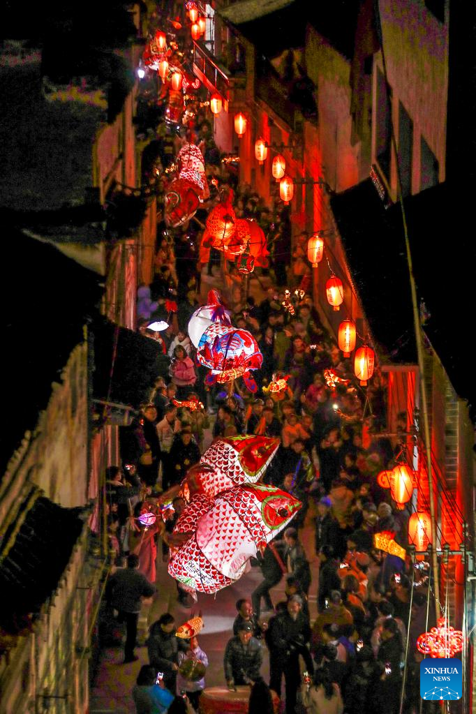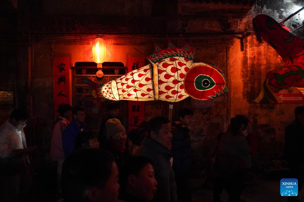 People holding fish-shaped lanterns parade during the new year celebrations in Shexian County of Huangshan City, east China's Anhui Province, Jan. 31, 2023. (Xinhua/Du Yu)