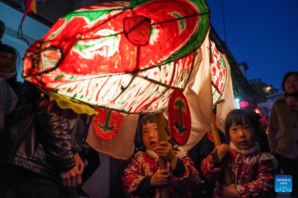 Children holding fish-shaped lanterns parade during the new year celebrations in Shexian County of Huangshan City, east China's Anhui Province, Jan. 31, 2023. (Xinhua/Du Yu)