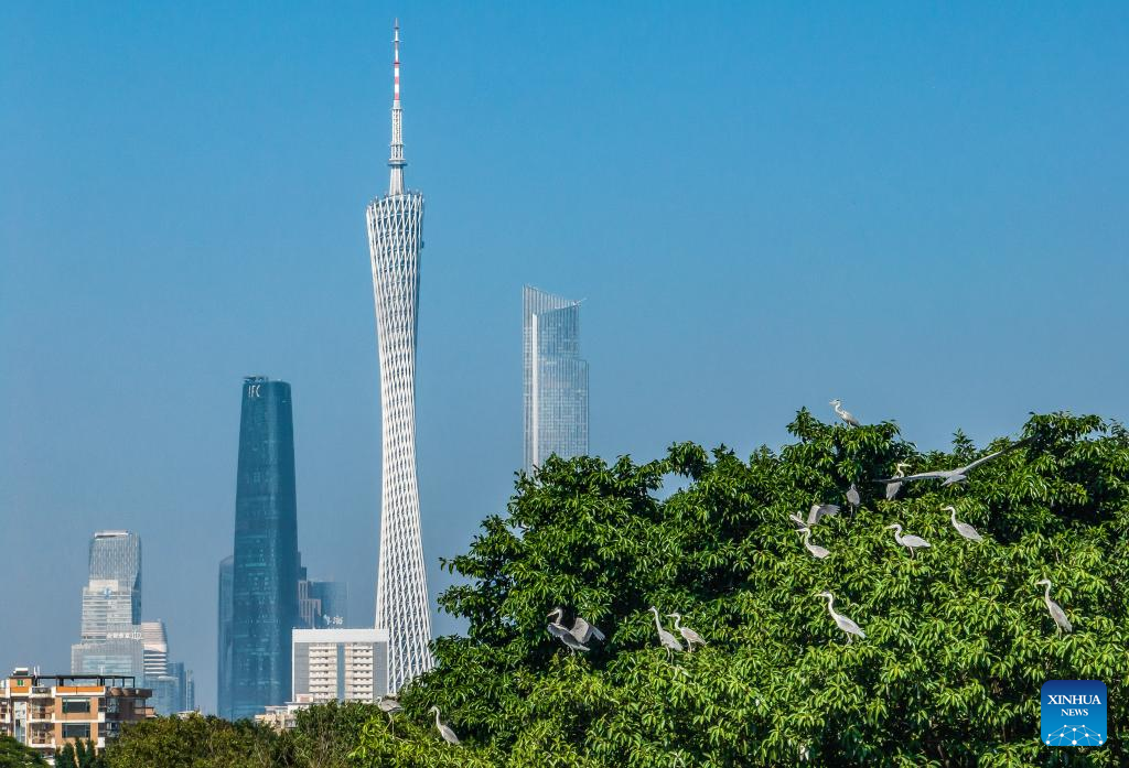 Egrets are seen at Haizhu Wetland in Guangzhou, south China's Guangdong Province, Jan. 7, 2023. (Photo by Xie Huiqiang/Xinhua)