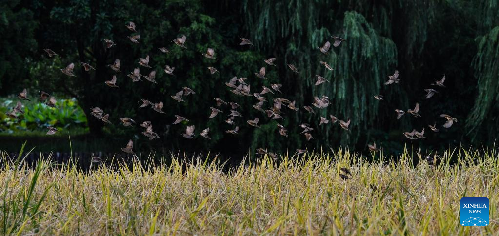 Scaly-breasted munias are seen at Haizhu Wetland in Guangzhou, south China's Guangdong Province, July 25, 2020. (Xinhua/Liu Dawei)