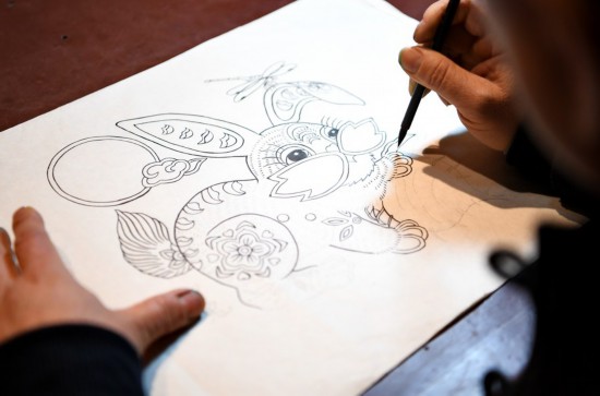 An artist works on a New Year painting themed on rabbit at the Wuqiang woodblock New Year painting museum in Wuqiang County, north China's Hebei Province, Feb. 3, 2023. (Xinhua/Mu Yu)