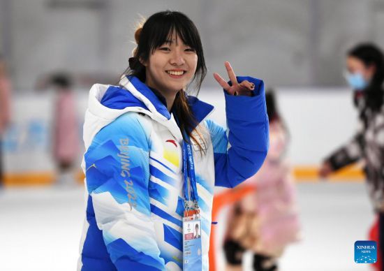 Hu Baiying, venue operation team member of Beijing 2022 Winter Olympics, experience winter sports activities at National Aquatics Centre (the "Ice Cube") in Beijing, capital of China, Feb. 4, 2023. Activities were held here on Saturday to mark the one-year anniversary of Beijing 2022 Winter Olympics. (Xinhua/Ren Chao)