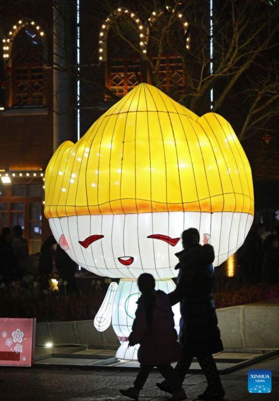 Tourists view a lantern at Liaohe ancient street in Yingkou, northeast China's Liaoning Province, Feb. 3, 2023. The Liaohe ancient street has been decorated with various lanterns to greet the Lantern Festival, the 15th day of the first month of the Chinese lunar calendar, which falls on Feb. 5 this year. (Xinhua/Yao Jianfeng)