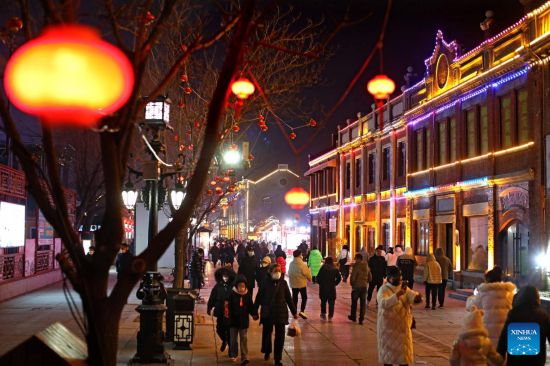 Tourists view lanterns at Liaohe ancient street in Yingkou, northeast China's Liaoning Province, Feb. 3, 2023. The Liaohe ancient street has been decorated with various lanterns to greet the Lantern Festival, the 15th day of the first month of the Chinese lunar calendar, which falls on Feb. 5 this year. (Xinhua/Yao Jianfeng)
