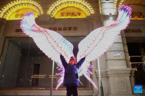A tourist poses for photos at Liaohe ancient street in Yingkou, northeast China's Liaoning Province, Feb. 3, 2023. The Liaohe ancient street has been decorated with various lanterns to greet the Lantern Festival, the 15th day of the first month of the Chinese lunar calendar, which falls on Feb. 5 this year. (Xinhua/Yao Jianfeng)