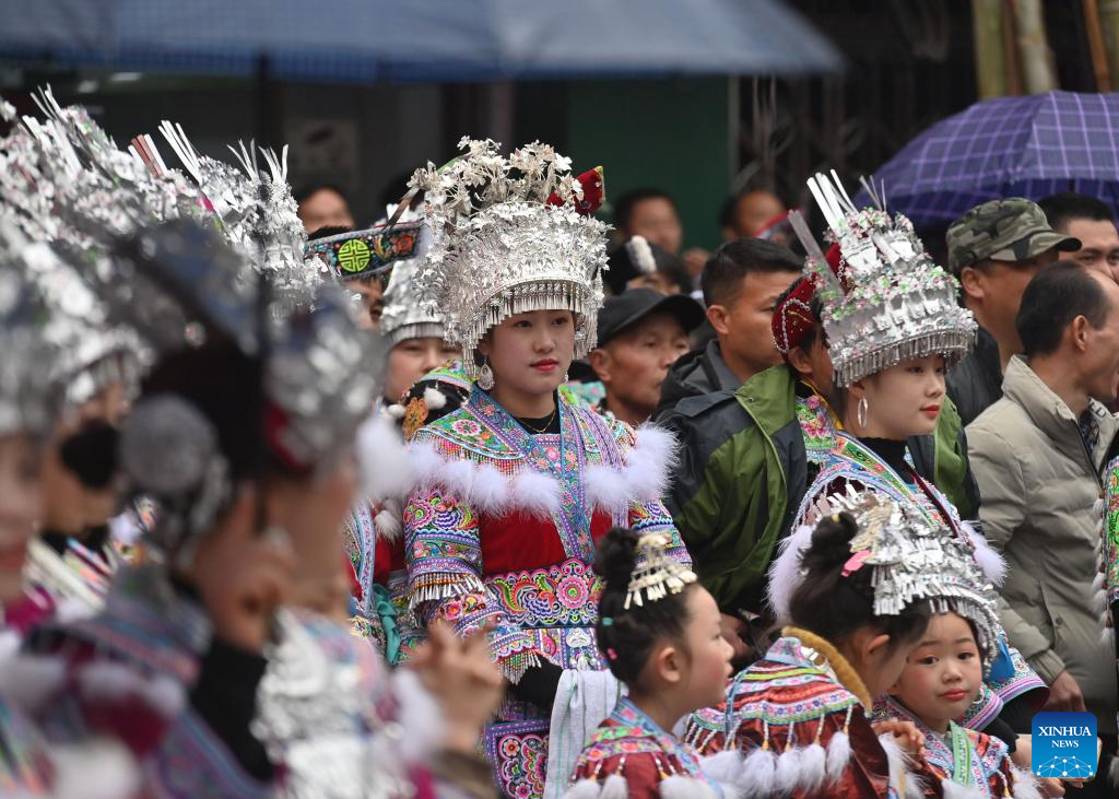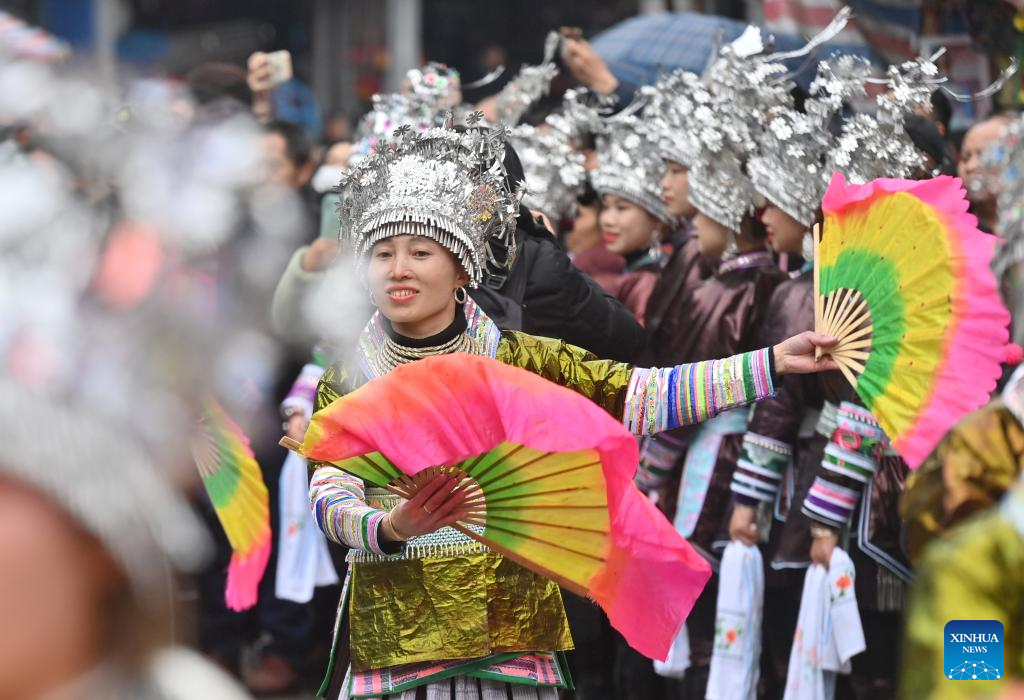 People of Miao ethnic group take part in the "Bainiaoyi" Lusheng festival in Dangjiu Village, Gandong Township, Rongshui Miao Autonomous County, south China's Guangxi Zhuang Autonomous Region, Feb. 2, 2023. "Bainiaoyi" Lusheng festival is a traditional festival in Gandong Township, which is held on the 12th day of the first month on Chinese lunar calendar, during which people wear "bainiaoyi," a traditional clothing of ethnic group, blow Lusheng, a traditional reed-pipe wind instrument, and perform traditional dancing. (Xinhua/Huang Xiaobang)