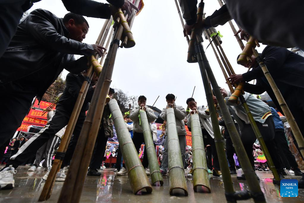 People of various ethnic groups blow Lusheng, a traditional reed-pipe wind instrument, during the "Bainiaoyi" Lusheng festival in Gandong Township, Rongshui Miao Autonomous County, south China's Guangxi Zhuang Autonomous Region, Feb. 2, 2023. "Bainiaoyi" Lusheng festival is a traditional festival in Gandong Township, which is held on the 12th day of the first month on Chinese lunar calendar, during which people wear "bainiaoyi," a traditional clothing of ethnic group, blow Lusheng and perform traditional dancing. (Xinhua/Huang Xiaobang)