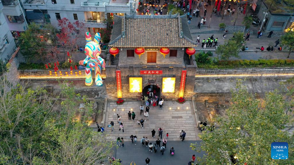 Tourists visit a Lantern Festival fair held in Nantou ancient town in Shenzhen, south China's Guangdong Province, on Feb. 4, 2023. A fair was held in Nantou ancient town to celebrate the upcoming Lantern Festival, which falls on Feb. 5 this year. (Xinhua/Liang Xu)