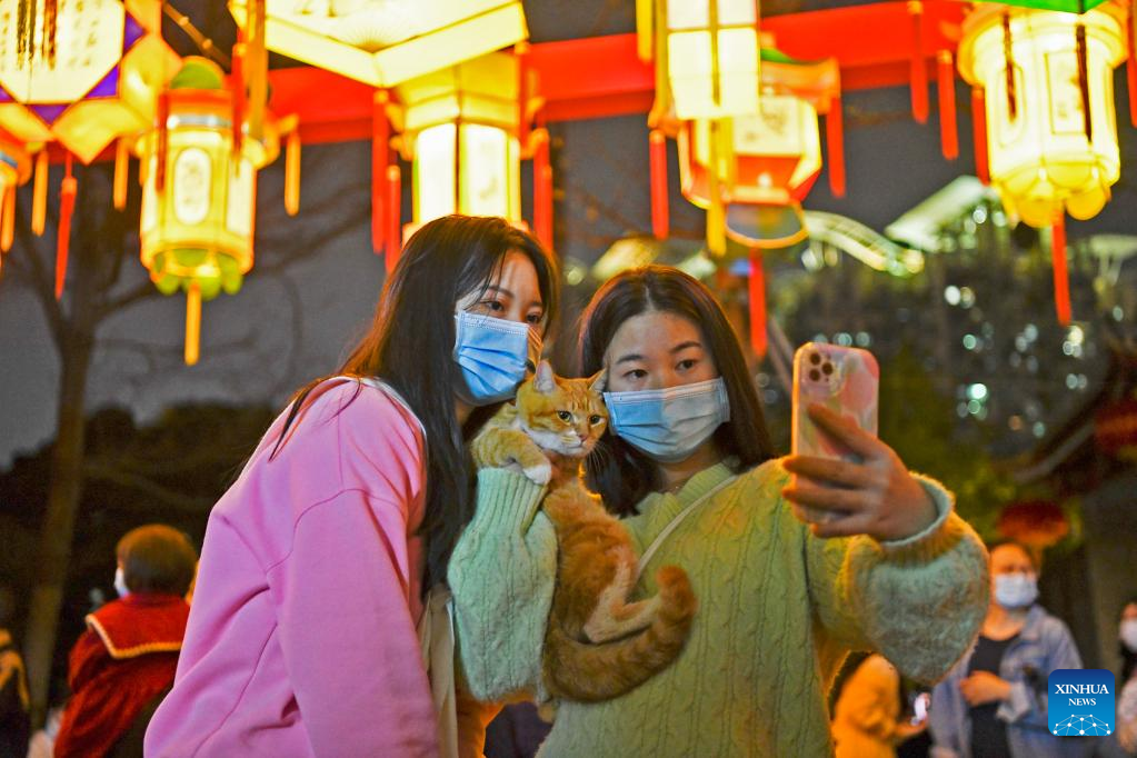 Tourists pose for photos with lanterns during a Lantern Festival fair held in Nantou ancient town in Shenzhen, south China's Guangdong Province, on Feb. 4, 2023. A fair was held in Nantou ancient town to celebrate the upcoming Lantern Festival, which falls on Feb. 5 this year. (Xinhua/Liang Xu)