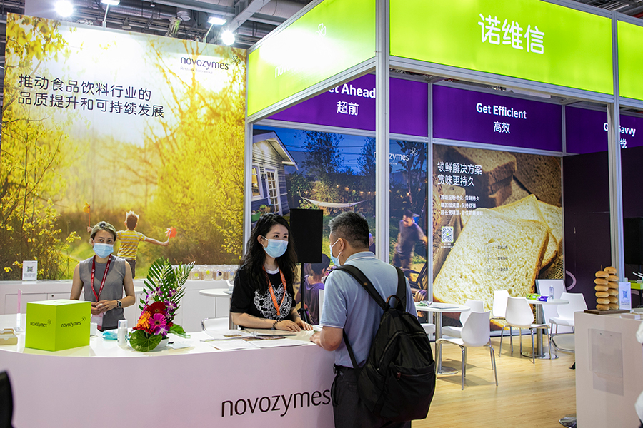 An employee introduces products from Novozymes A/S, a Denmark-headquartered biotech giant, to a visitor during the Food Ingredients China 2021 held in Shanghai in June 2021. FDI inflows into China surged more than 55 percent from 2012 to 2021. [PHOTO/CHINA DAILY]