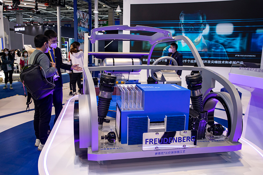 An employee introduces vehicle power battery and fuel cell from Freudenberg, a Germany-headquartered global tech firm, to a visitor during the fifth China International Import Expo held in Shanghai in November. [PHOTO/CHINA DAILY]
