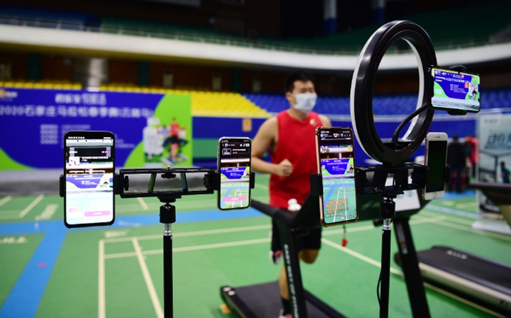 With the help of a route-tracking app, a runner participates in an online marathon event at a stadium in Shijiazhuang, Hebei Province, on April 12, 2020. (Photo/Xinhua)