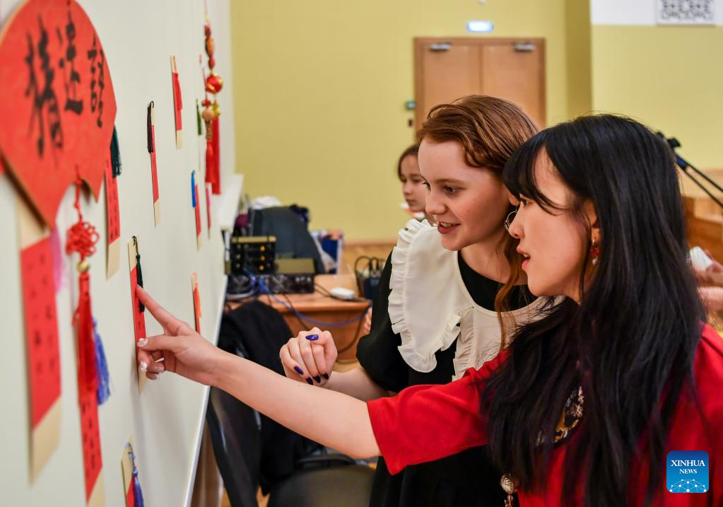Students participate in a riddle-guessing activity in celebration of the Chinese Lunar New Year at the Confucius Institute of the Russian State University for the Humanities in Moscow, capital of Russia, Feb 3, 2023. (Xinhua/Cao Yang)