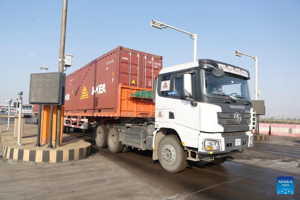 This photo taken on Jan. 25, 2023 shows a cargo truck passing through Ganqmod Port in the city of Bayannur, north China's Inner Mongolia Autonomous Region. (Xinhua/Li Yunping)