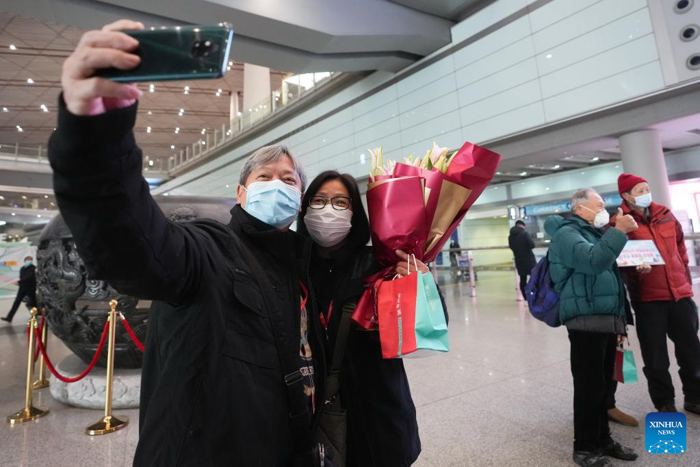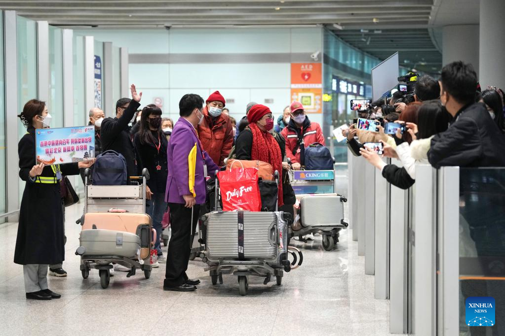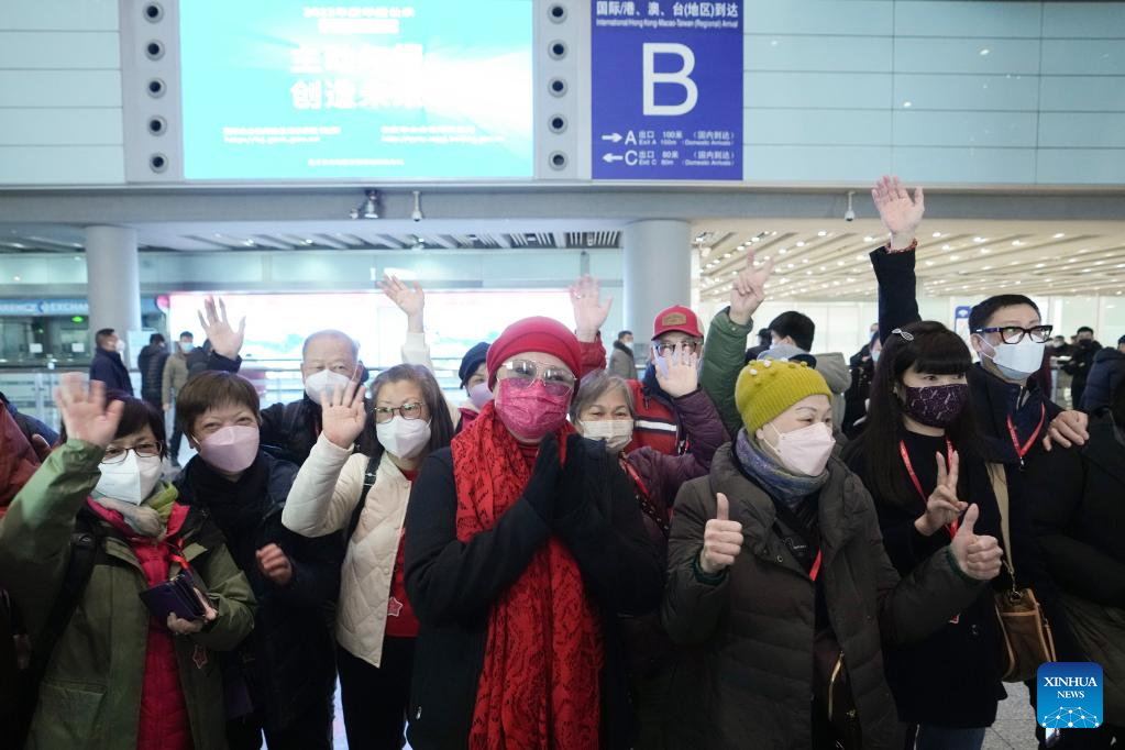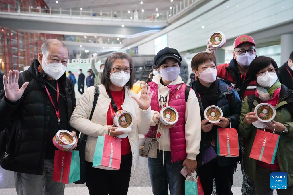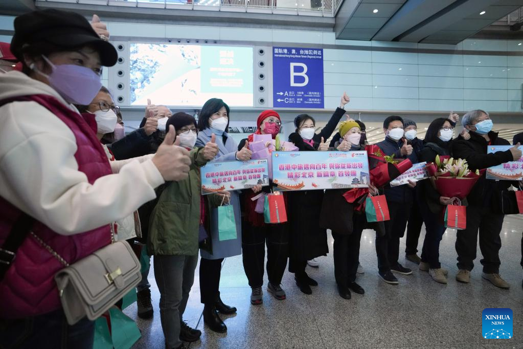 The first tour group from Hong Kong arrive at Beijing Capital International Airport in Beijing, capital of China, Feb. 6, 2023. (Xinhua/Ju Huanzong)