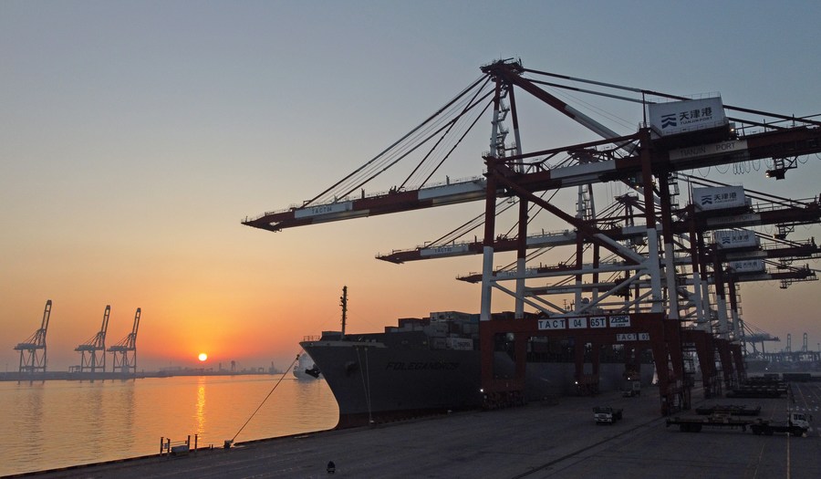 This photo taken on Jan. 1, 2023 shows the sunrise scenery at the Tianjin Port in north China's Tianjin. (Xinhua/Zhao Zishuo)