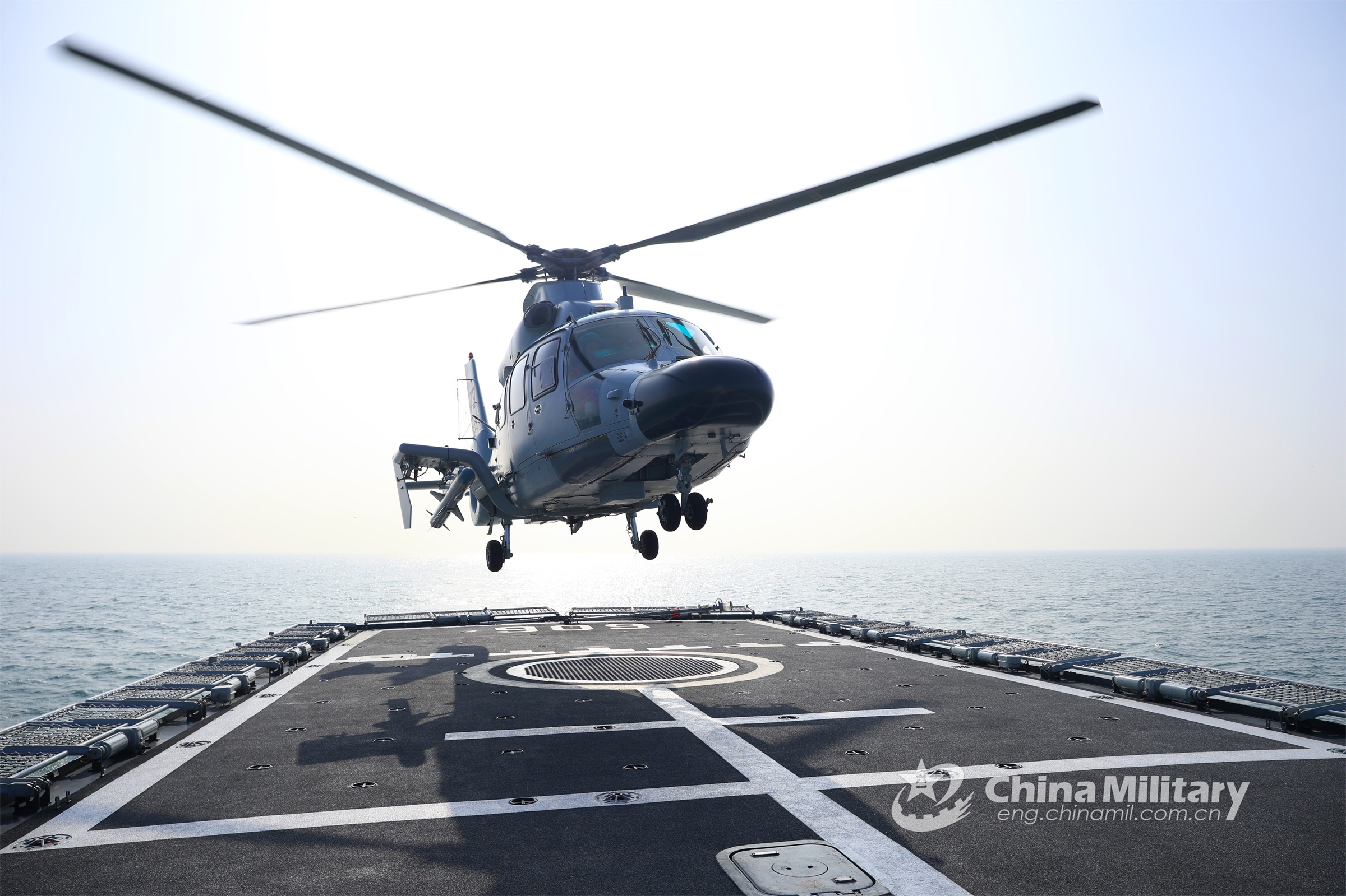 A helicopter attached to a frigate flotilla with the navy under the PLA Northern Theater Command lands on the deck during a combat training exercise held on January 7, 2022. (eng.chinamil.com.cn/Photo by Wang Guangjie)